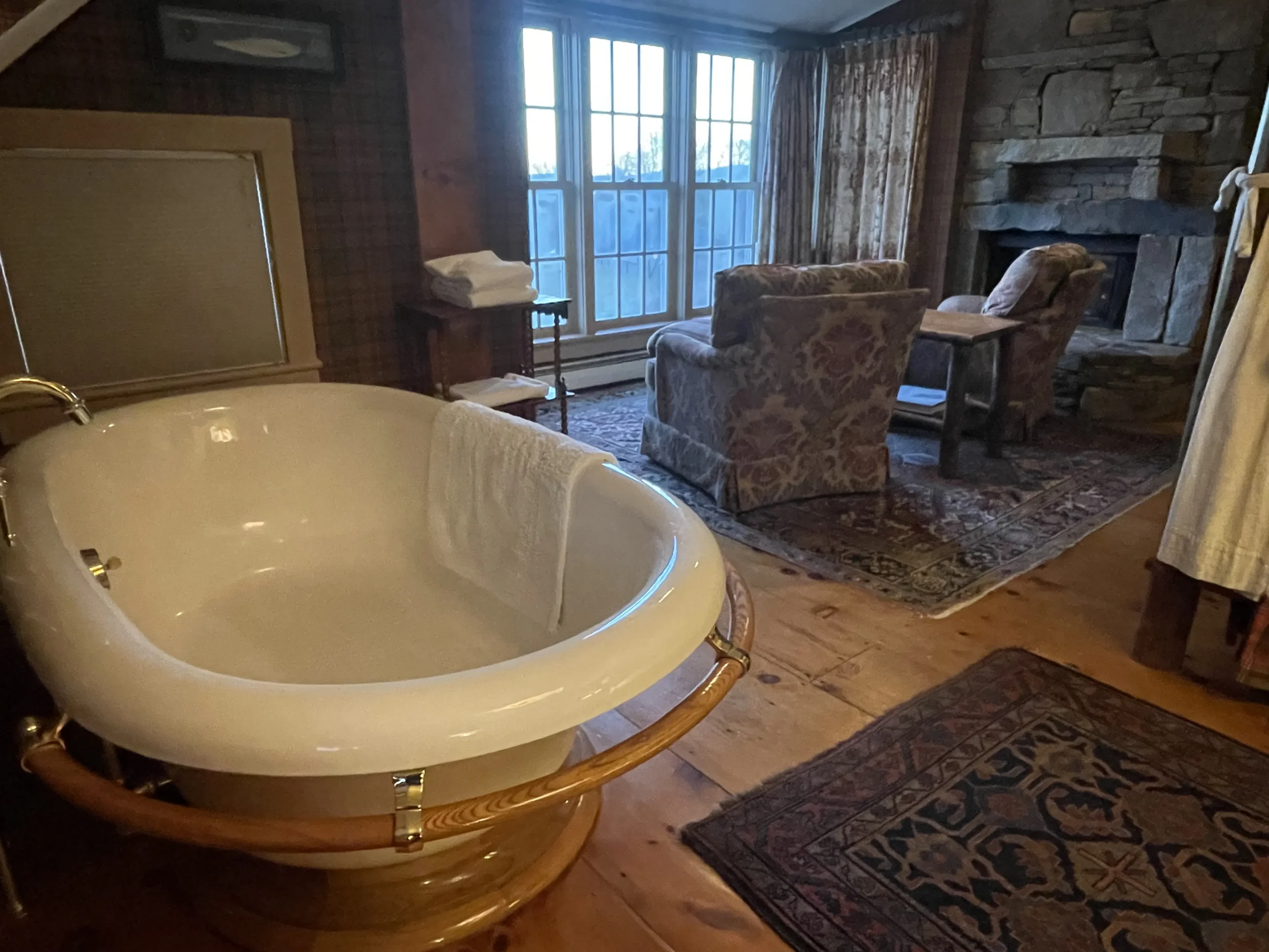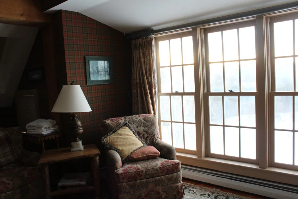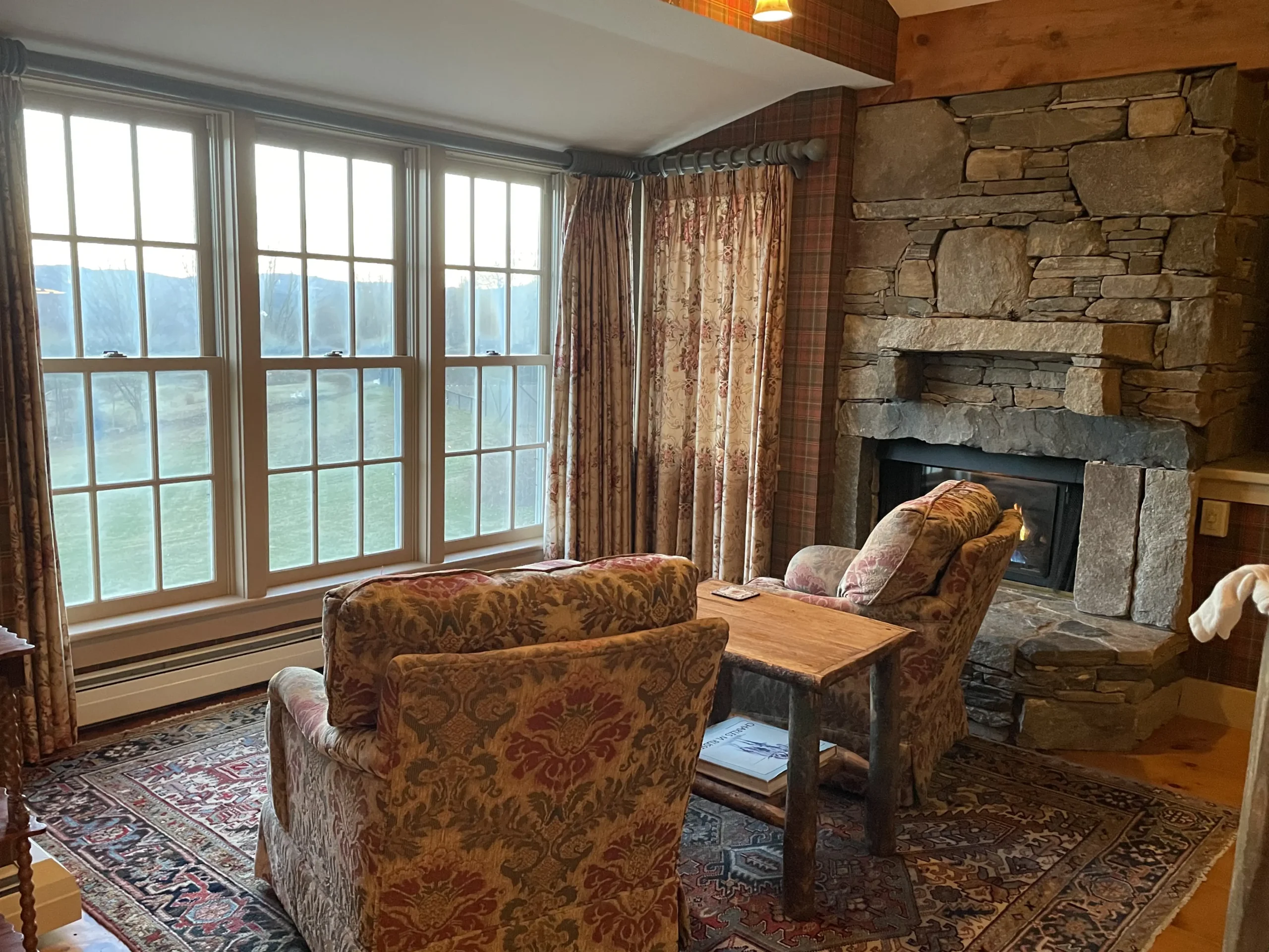 Across the hall from Marion Goodfellow, Meadowlook is probably our most popular room. With a rustic aesthetic, a sitting area looking out a large bay window over the Inn’s meadows next to a stone fireplace, a soaking tub in the room, and a balcony looking out to the mountains, Meadowlook is the perfect space for a romantic getaway.