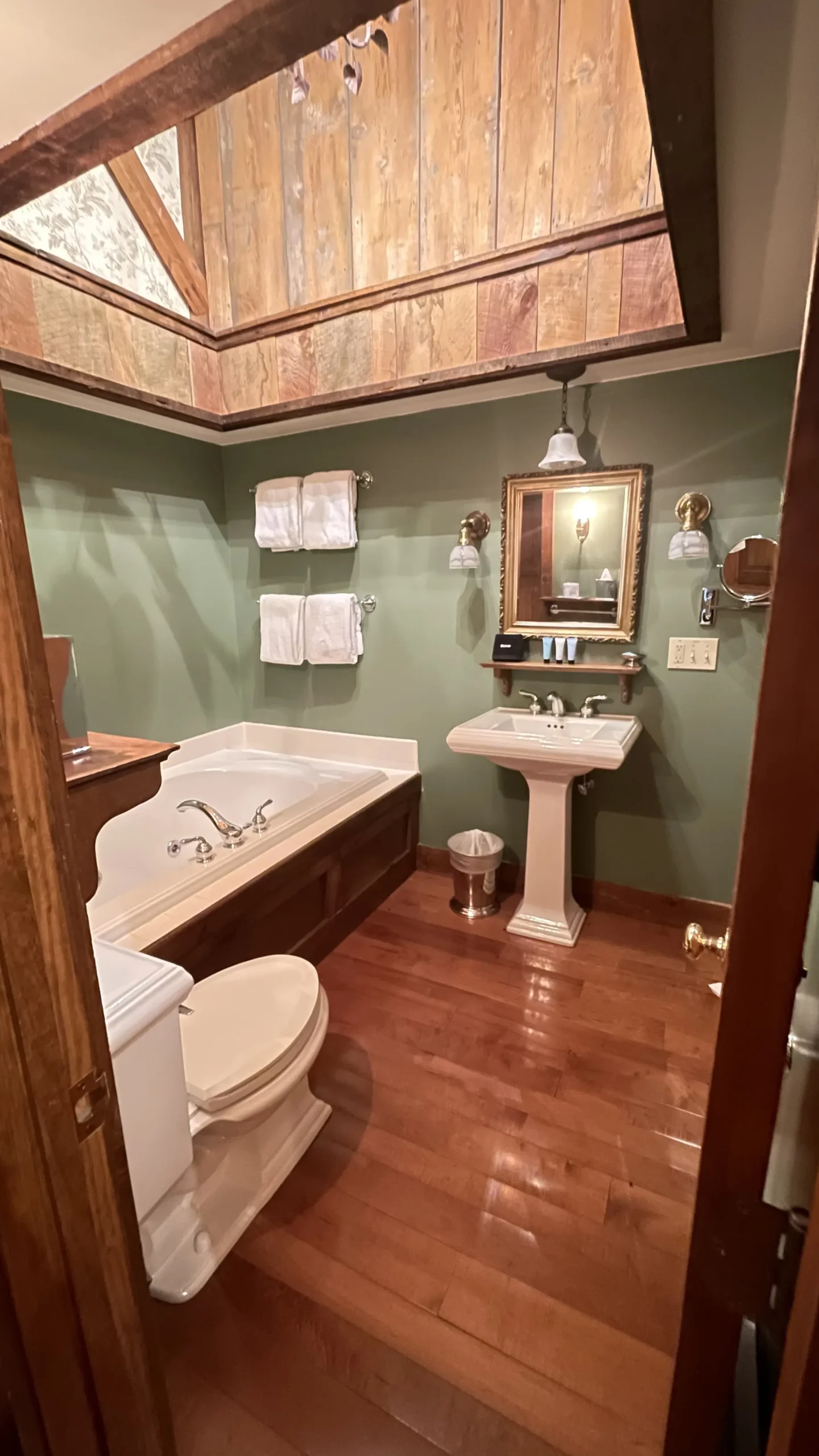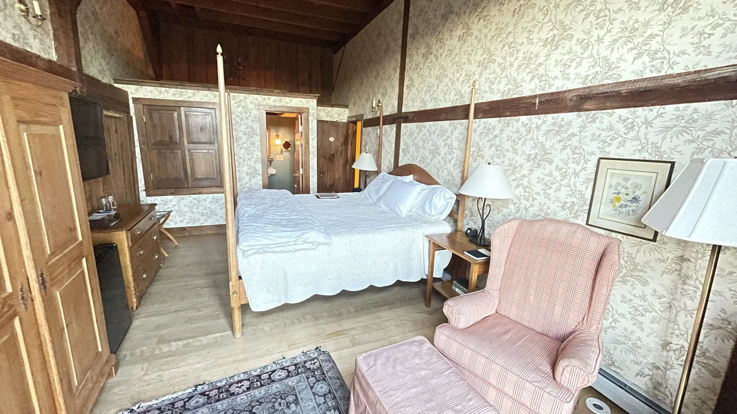 Right across the hall from Matilda’s room and boasting an expansive mountain view, with a sliding door leading straight out into the Inn’s meadows, William’s room is a wonderful space to relax and enjoy the quiet. Enjoy the high ceilings and rustic design to give you the feeling of a proper Vermont getaway. Also in William are a private bath with both a shower and a whirlpool tub, a gas stove, a sitting area, and a four-poster king bed.